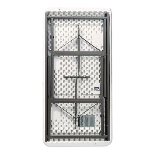 Tables for indoor and outdoor usage. Blow-molded, high-density polyethylene top is dent, scratch, stain and water resistant. Legs fold into underside cavity. Folds to 2" for storage. Charcoal gray powder coated 1" steel tub legs with non-marring feet.