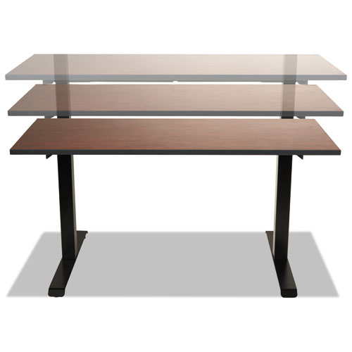 Set the perfect height when sitting or standing, when you choose this electric, two-stage, height-adjustable table base. Durable, powder-coated steel base features a 250 lb maximum lift capacity (maximum capacity includes the sold-separately table-top), a lift/lower range from 27" to 45.2" as well as a standard up-and-down control set. Dual-motors provide speeds of up 0.8" per second (depending on overall load); and though designed specifically for use with ALETT Series Reversible Laminate Rectangular Table Tops (sold separately), these steel-frame bases attach to most common rectangular tops ranging from 47.5" to 72" in width and 24" to 36" in depth. Integrated crossbar supports prevent racking while ensuring overall stability. Adjustable leveling glides help you compensate for uneven floors. Base includes integrated cable-management channels and a 9.8 ft power cord. Quick-setup design with fold-out legs. Table tops and bases are sold and shipped separately—ORDER BOTH.