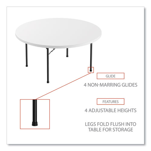 Versatile and convenient round folding table sets up quickly for banquets, dinner, or events where extra space is needed. Tables are perfect for indoors or outdoors. Blow-molded polyethylene top is water and stain resistant to ensure it won't crack or stain. Strong, durable, powder-coated metal construction withstands dents and scratches. Slide lock feature enhances table stability once opened. Legs fold flush into table creating a flat surface for easy storage and stacking. Non-marring foot caps prevent floor damage. Supports up to 600 lbs of evenly distributed weight.