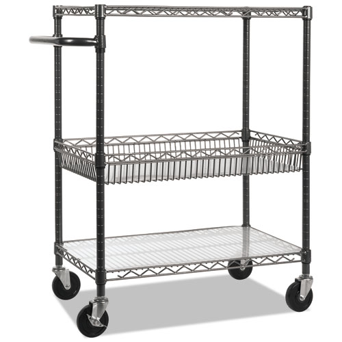 Three-Tier Wire Cart with Basket, Metal, 2 Shelves, 1 Bin, 500 lb Capacity, 34" x 18" x 40", Black Anthracite