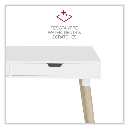Scandinavian writing desk is a simple and modern working desk that's ideal for working or studying. The multi-function desk is constructed with a durable, white laminate top and beige wood-colored, angled, wood legs. The wide, smooth work surface allows you to manage multiple tasks at once such as working on a computer and taking notes. The desk includes two large, glided drawers which provide optimal storage. Designed with a clean look that takes up minimal space on the floor and fits the décor of most spaces. Some assembly is required.