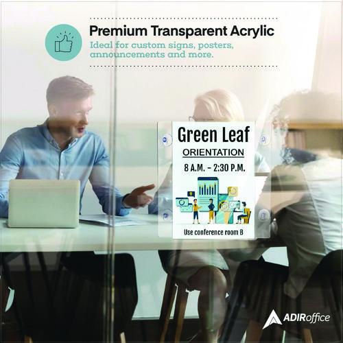Acrylic sign holder is the best alternative to taped notices and subsequent challenges of removing tape residue from glass surfaces. Notices easily slip into the clear sign holder to reach incoming and outgoing patrons and personnel with relevant messages. Though firmly attached to glass surfaces with its four suction cups, the sign holder is easily lifted up and off to clean glass behind the sign support. Great for posting temporary notices for employees, customers, special events, sales, opening/closing hours and more.