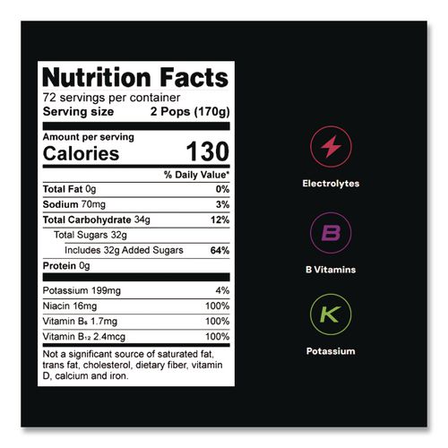 Freezer pops contain 100 mg potassium plus B vitamins and electrolytes. Refreshing and tasty! The Variety Pack contains Blue Raz, Fruit Punch, Lemon Lime, Orange flavored freezer pops. Simply remove pops from carton; place pops in freezer; once frozen, snip off the top and slide up to enjoy!