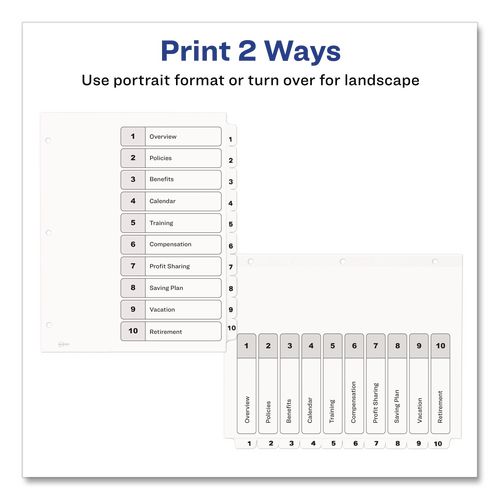 Easy referencing using coordinated Table of Contents page and matching preprinted white tab dividers. Extended tab reinforcement and double-sided hole reinforcement on heavier weight paper prevents tearing. Use in portrait or landscape formats. Easy to customize with free templates and designs from Avery Design & Print. For laser and inkjet printers.