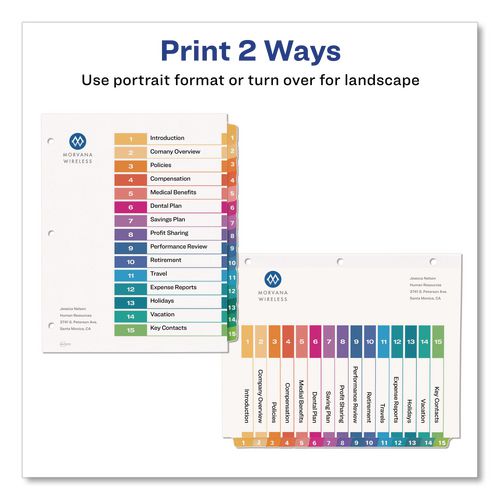 Organize documents quickly and easily without tab inserts or labels. Double-sided for use in portrait or landscape orientation. Heavyweight paper with double-sided reinforced holes and extended tab reinforcements. Easily customize the title page with free templates and designs from Avery Design & Print. For laser and inkjet printers.