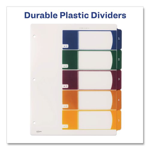 These durable plastic Table of Contents dividers with multicolor tabs offer a modern look. Print section titles onto a plain sheet of 8 1/2" x 11" paper, three-hole punch, and place behind the Table of Contents sheet. Contents sheet won't lift print. The coordinated system of a Table of Contents page and preprinted tab dividers makes referencing easy while delivering a professional look. Customize the Table of Contents page by adding section titles, as well as graphics or a company logo. Easy to customize with free templates from Avery Design & Print. For laser and inkjet printers.