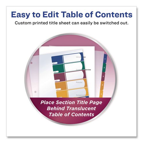 These durable plastic Table of Contents dividers with multicolor tabs offer a modern look. Print section titles onto a plain sheet of 8 1/2" x 11" paper, three-hole punch, and place behind the Table of Contents sheet. Contents sheet won't lift print. The coordinated system of a Table of Contents page and preprinted tab dividers makes referencing easy while delivering a professional look. Customize the Table of Contents page by adding section titles, as well as graphics or a company logo. Easy to customize with free templates from Avery Design & Print. For laser and inkjet printers.