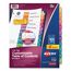 These durable plastic Table of Contents dividers with multicolor tabs offer a modern look. Print section titles onto a plain sheet of 8 1/2" x 11" paper, three-hole punch, and place behind the Table of Contents sheet. Contents sheet won't lift print. The coordinated system of a Table of Contents page and preprinted tab dividers makes referencing easy while delivering a professional look. Customize the Table of Contents page by adding section titles, as well as graphics or a company logo. Easy to customize with free templates from Avery Design & Print. For laser and inkjet printers.