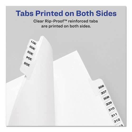 Organize index briefs, legal exhibits, mortgage documentation files and more. White paper stock gives files a professional appearance. Rip-Proof™ reinforced tabs are printed on both sides. Binding edge is unpunched so indexes can fit practically any binding system. Avery Style is Helvetica bold type style and Allstate Style is Helvetica regular type style.