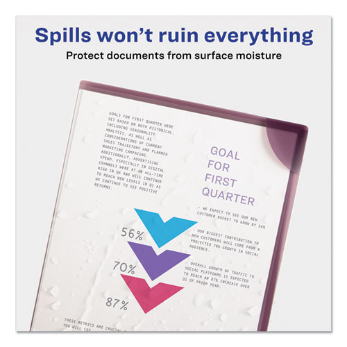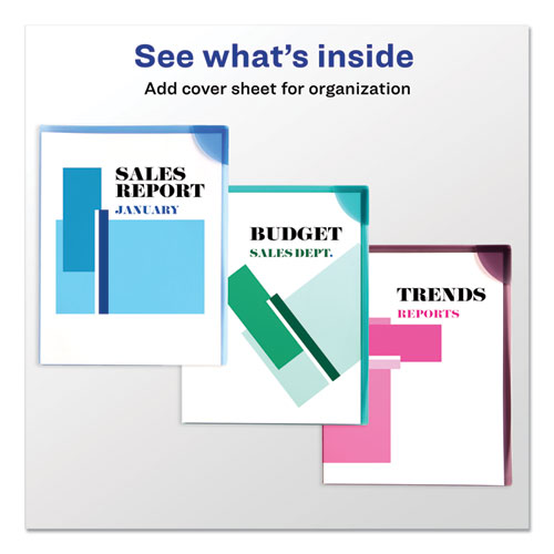 Corner Lock® feature ensures papers won't fall out. Translucent colored back cover with clear front cover for color coding and easy identification of contents. Sealed on two sides for easy access. Durable, yet lightweight and portable. Non-stick, polypropylene material won't lift print. Sleeves hold up to 20 sheets of 8.5" x 11" paper.