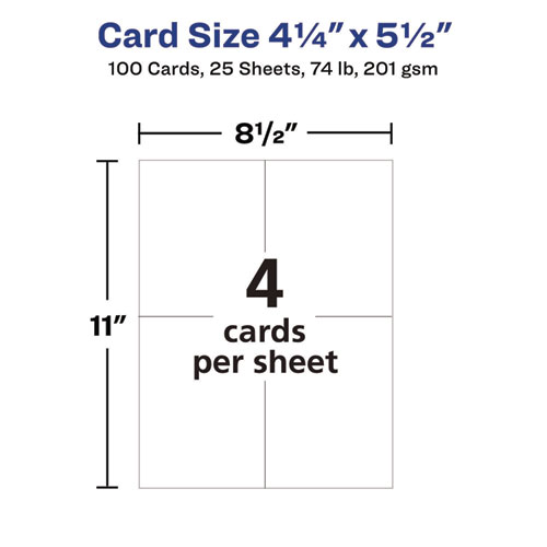 Create professional-looking invitations, announcements, reminders, seasonal offers and more. Sturdy bright white cardstock is either matte-coated for vivid graphics and sharp text or has a premium quality glossy finish ideal for photos. Ultra-fine perforations let you separate cards cleanly and easily. Meets U.S. postal regulations for postcards. Easy to customize with free templates and designs using Avery Design & Print Online. 8.5" x 11" sheets.