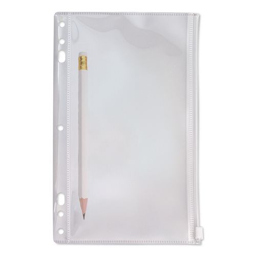 Keep writing instruments, paper clips and various loose items neatly contained and close by. See-through, polypropylene body with a plastic snag-proof zipper pull. Hole-punches allow use in various size binders.