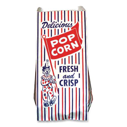 Pinch-Bottom Paper Popcorn Bag, Delicious Popcorn: Circus Clown Icon Labeling, 4" x 1.5" x 8", Red/White/Blue, 1,000/Carton