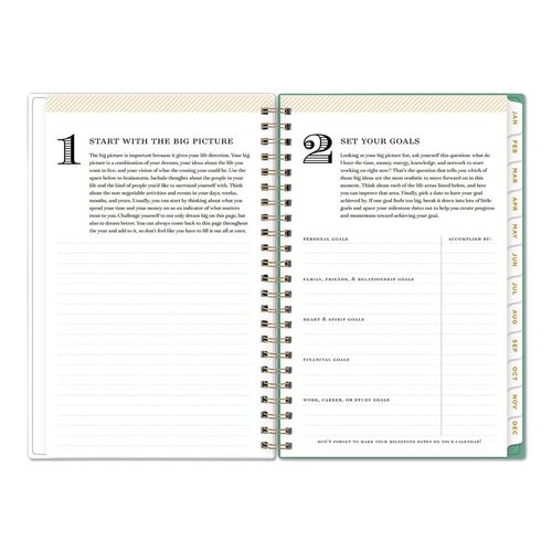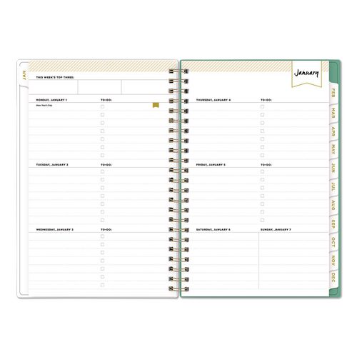 - Weekly view per two-page spread contains space for daily schedule, to-do list, notes and gratitude sections, and an inspirational quote.
