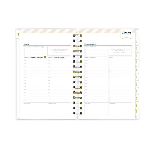 Design your life with Day Designer. An introductory letter from Whitney English and special worksheets designed for identifying and fulfilling your personal goals get you started. Daily planner section features one-day per page views Monday through Friday and two-day per page views for Saturday and Sunday. Two-page per month spreads feature ruled daily blocks and a Notes & To Do checklist.