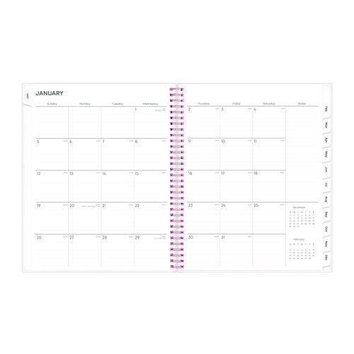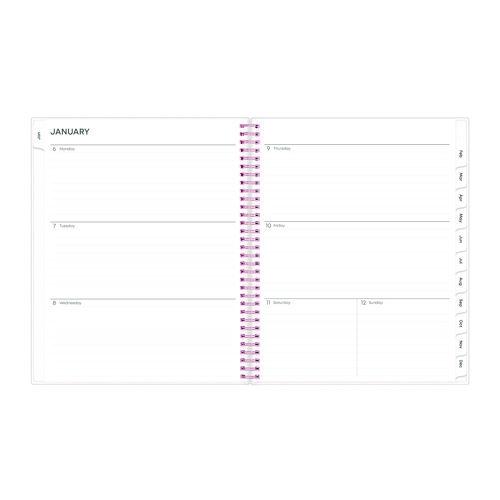 Weekly calendar view per two-page spread contains ruled space for your daily schedule. Two page per month spreads feature ruled daily blocks, Notes column, Sunday through Saturday scheduling and more. A flexible frosted cover adorns the outside while twin-wire binding and durable, coated tabs offer easy page turning and access to past, present and future months. Six bonus monthly views (July - Dec).