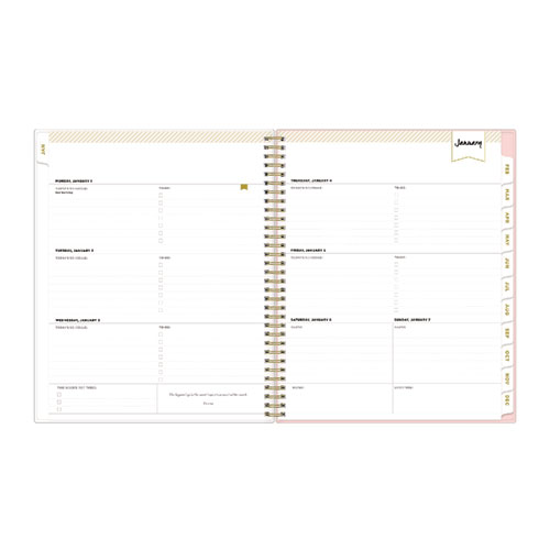- Weekly view per two-page spread contains space for daily schedule, to-do list, notes and gratitude sections, and an inspirational quote.