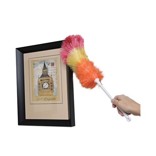 Bright, multicolor synthetic duster attracts dust via static electricity. Dust retains in fibers until shaken. Durable, flexible head adapts to every application and is easily maneuvered around items. Washable and reusable. Handle has hang-up or lanyard hole. Ideal for light dusting around sensitive objects. The duster draws the dust away from surfaces without the need for cleaning products. Lightweight and portable design is ideal for cleaning mobility.