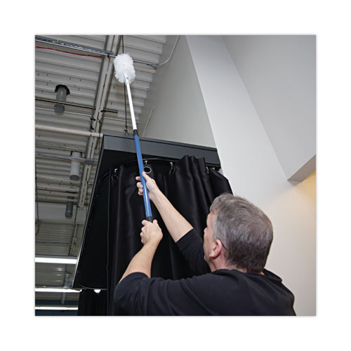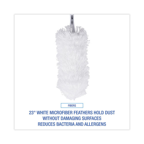 Tiny microfiber hooks grab and hold dust particles without damaging sensitive surfaces. Dusts without chemicals. Reduces bacteria and allergens. Flexible head for dusting in tight areas. Easily remove duster head for hand-washing. End of handle is fitted with standard threads to accommodate Boardwalk® telescopic handle (sold separately).