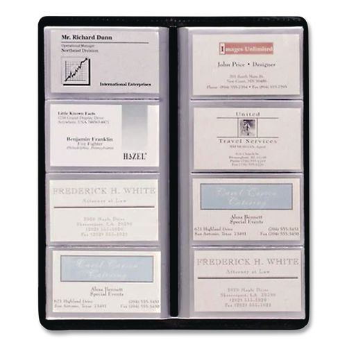 Keep payment cards and contacts in one place with this card file that holds up to 96 total cards. Features non-glare vinyl pages that can hold up to eight cards each. Cover made of leather-grain vinyl.