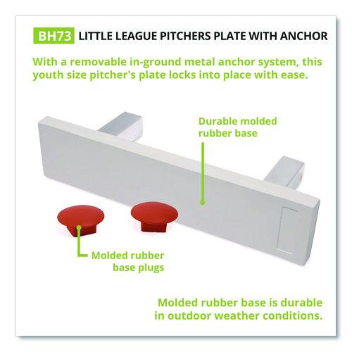 Perfect for youth games and tournaments, this pitcher's plate with anchor easily secures into the ground on the pitcher's mound. With a removable in-ground metal anchor system, this youth size pitcher's plate locks into place with ease.