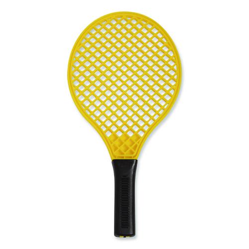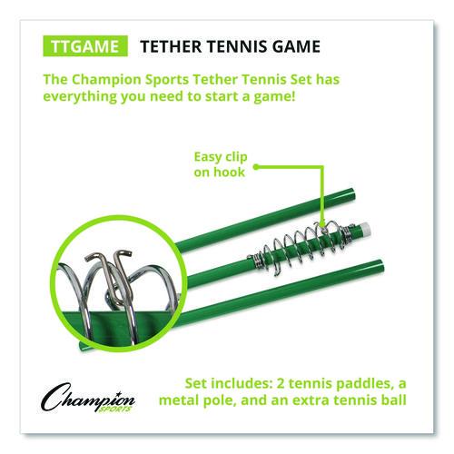 Similar to tetherball, tether tennis uses two tennis paddles to wrap a ball around a pole. This set has everything you need to start a game! Featuring a metal pole with swivel arm and spiral coil, the easy clip-on hook attaches the tennis ball to the pole with a 64” rope. The set includes two tennis paddles and one extra tennis ball.