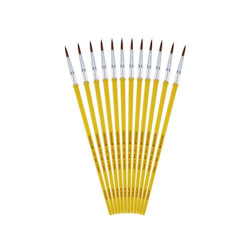 - Camel hair watercolor paint brushes feature a round head and short plastic handle.