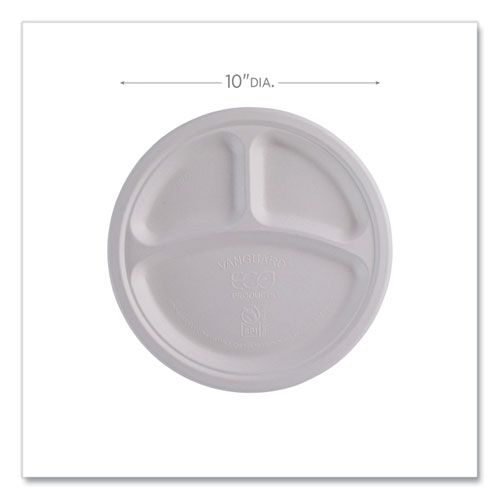 Vanguard Renewable and Compostable Sugarcane Plates, 3-Compartment Plate, 10" dia, White, 500/Carton
