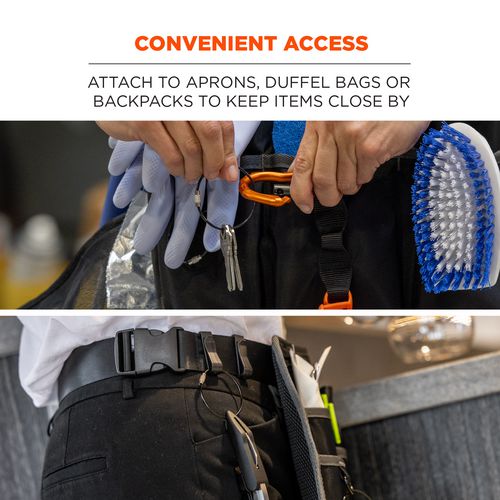 Designed to keep items and tools close for quick and easy access while on the job. Multi-functional in use, these key rings can be attached to aprons, duffel bags, backpacks and more. They are built to last and feature black coated iron for added protection and durability over time. To install, simply unscrew the twist lock mechanism and thread through the captive eye of a tool, such as cleaning brush, duster, mesh wash bags, glove clips or keys, and screw back together. Compatible with the Arsenal 5715 Cleaning Apron and Arsenal 5716 Server Apron.