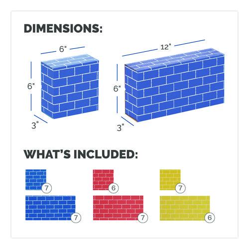 - Set includes blocks in two sizes (12" x 6" x 3" and 6" x 6" x 3") and three colors.