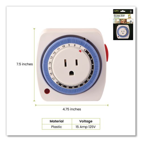 This 24-hour mechanical timer automatically powers lamps, holiday lights and appliances—saving energy and money. Features include a 15 A rating, three-prong compatibility, override switch and indicator light. Free product recycling included.