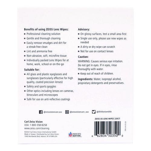 ZEISS pre-moistened lens wipes provide a gentle, thorough cleaning, removing fingerprints, dust, and smudges without scratching or streaks. Individually wrapped and disposable lens cleaning wipes can be conveniently stored anywhere, so you can safely clean your glasses while you're on-the-go. ZEISS Lens Wipes easily remove smudges and dirt leaving your glasses as clean as the first day you got them.