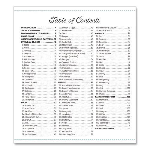 Learn to draw tons of cute and quirky stuff with more than 100 step-by-step drawing projects. This drawing book is perfect for beginners, as well as young artists, with its simple illustrations and easy-to-follow drawing steps. You'll learn to draw everyday objects including a teapot, balloons and a terrarium; food, including a cinnamon bun, a sushi roll and strawberries; nature, including a mushroom, a tiny forest and a rainbow and cloud; animals, including a red panda, a sloth and a cow; mythical creatures, including a yeti, a dragon and a jackalope. For those who want to learn how to draw everything adorable and amusing, this book is for you.