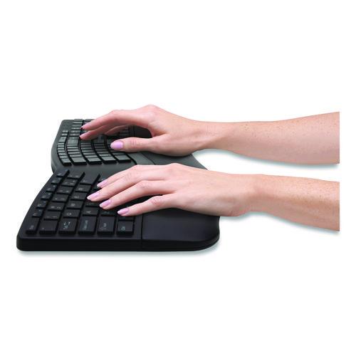 Ergonomist-approved design positions your hand for improved comfort. Split and sloped keyboard with adjustable reverse tilt positions hands, wrists and forearms for comfort and neutral alignment. Built-in wrist rest supports, cushions, and cradles the wrists. Dual wireless with 128-bit AES encryption security delivers the flexibility of 2.4 GHz and Bluetooth® 4.0 LE, with government-grade encryption. Quiet clicking means typing and mousing is smooth, easy, and non-disruptive. Spill-proof keys make cleanup fast and easy. If your receiver is ever lost or damaged, simply purchase a new one (K75223WW), pair it with your device, and you're all set. Five mouse buttons (including forward and back) enhance navigation and productivity. Three-mode power-saving switch allows you to toggle between 2.4 GHz, Bluetooth® and Off for best battery life. Caps Lock, Numbers Lock, Scroll Lock, and F-Keys are popular features that make typing and navigating easier and more efficient. This product is designed to comfortably fit users with average to larger sized hands.