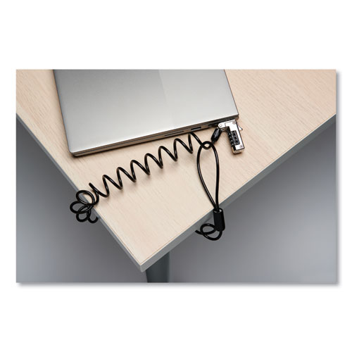 Slim lockhead allows the laptop to lie flat and stable. Won't block valuable ports, allowing for full use of the laptop while attached. Resettable four-wheel number code lets you choose from 10,000 possible combinations. Pivot and rotate cable head featuring one-handed operation allows for easy and flexible connection and movement. Self-coiling carbon steel cable sheathed in plastic stretches up to 6 ft and shrinks down to 76 mm for easy portability. Register & Retrieveā¢, Kensington®'s free online code registration program allows for quick, secure and easy lookup if the combination is ever lost or forgotten. Kensington® locks are verified and tested. Each lock is precision engineered to meet or exceed rigorous industry standards for strength, physical endurance and mechanical resilience.
