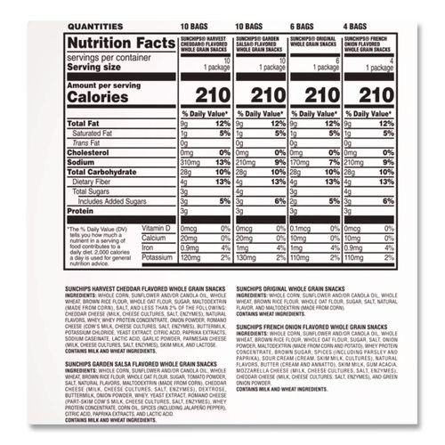Hearty grains, snappy crunch and great taste rolled into a light-textured and crispy chip. Variety mix contains all of your favorite flavors for a better snacking alternative.