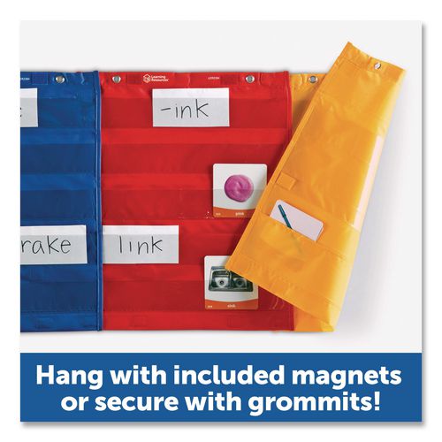 Use the four colored charts alone, or connect vertically or horizontally with hook-and-loop fasteners to make a larger chart. Great for small groups, centers, combined whole-group displays and more. Features five rows of clear pockets for your own cards, plus two large storage pockets on the reverse side.