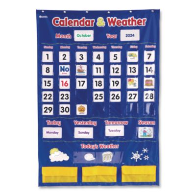 This pocket chart makes teaching your students about the calendar and weather a breeze. Double-sided, full-color cards feature numbers, days, months, years, holidays, celebrations, seasons and weather conditions to encourage daily use. Storage pockets conveniently hold all of the cards. Included activity guide helps encourage a fun learning experience. Flame-retardant vinyl chart features grommets for easy hanging. Chart is designed for children ages three to six.