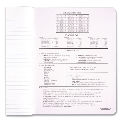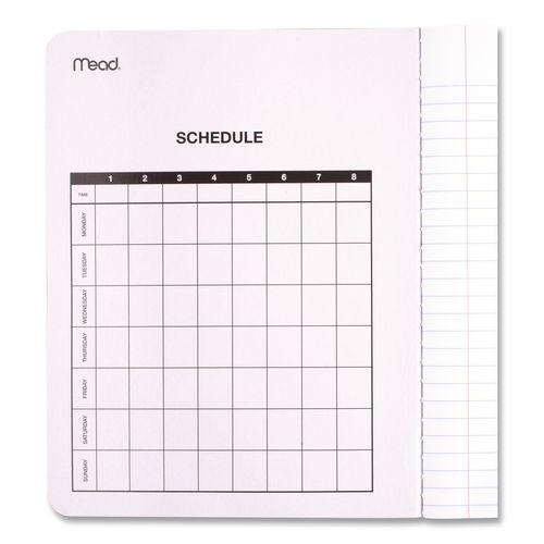 Durable cover with nameplate that allows you to name or number each notebook. Secure sewn binding. Class schedule grid on inside front cover. Multiplication table, conversion table and grammar rules on inside back cover. Black marble.