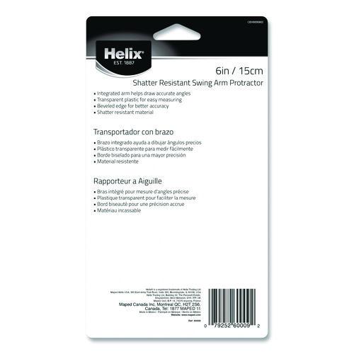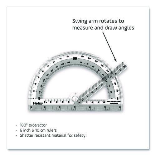 Protractor with integrated swing arm that rotates 180° for super accurate and easy visual angle measuring. Great for younger students who are learning how angles work. The swing arm protractor is made with shatter-resistant materials for safety. Protractor body features integrated 6" and 10 cm rulers and a dual-graduated top curve so angles can be measured left to right or right to left. Transparent plastic makes it easy to see what you are measuring, and included beveled edges make for easy manipulation.