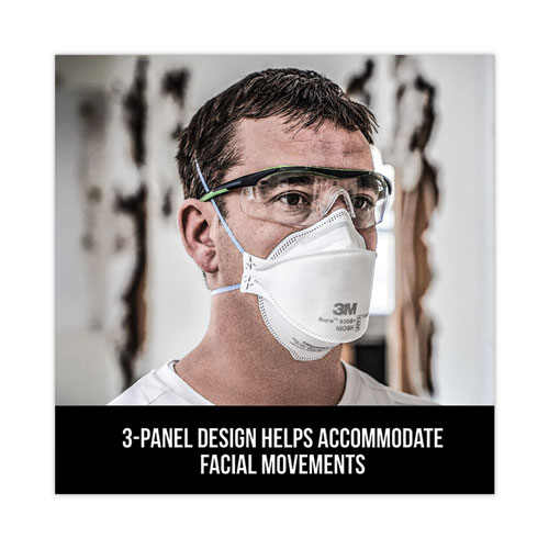 Designed to help provide respiratory protection of at least 95% filtration efficiency against certain non-oil based particles. The lightweight, three-panel designed respirator helps provide comfortable and convenient respiratory protection. 3M's proprietary filter media, 3M™ Advanced Electret Media, filters dust and other airborne particles, while allowing for easy breathing. The soft inner material provides added comfort and the adjustable nose clip help provide a custom seal.