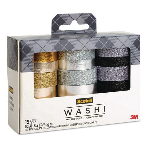 Washi Glitter Metallic Tape, Black/Gold/Silver, Assorted Sizes/Colors/Finishes, 15 Rolls/Pack