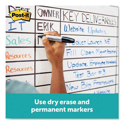 The dry erase whiteboard you can use with dry erase and permanent markers to help track due dates, to do's and metrics for your team projects. Transform your space by resurfacing a blackboard, stained whiteboard or cover an entire wall. With the use of permanent markers, there is less chance of accidental smearing or erasing, and the permanent marker wipes away with just water. Whenever you want to brainstorm, present or track projects, Post it® Brand is ready to help you succeed.