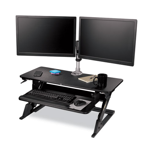 - Primary work surface is large enough to fit two 24'' monitors and holds up to 35 lb.