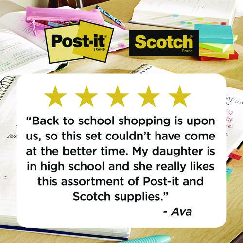 - Back-to-School Essentials kit included Post-it® Super Sticky Notes, Post-it® Flags, Scotch® Magic Tape, Scotch® Super-Hold Tape and Scotch 8" Multi-Purpose Scissors.