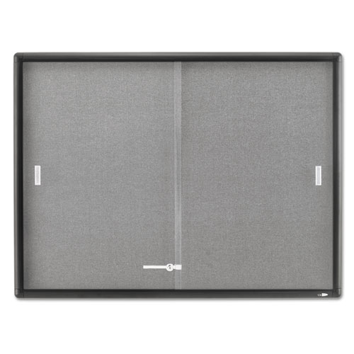 Enclosed Indoor Cork/Fabric Bulletin Board with 2 Sliding Glass Doors, 48" x 36", Gray Surface, Graphite Gray Aluminum Frame