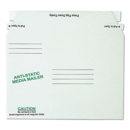 Sturdy fiberboard construction prevents damage due to bending, moisture and abrasion. Inner antistatic coating protects diskettes and other media. Features a convenient self-adhesive closure and Redi-Strip® tear strip flap. Holds three 3.5" diskettes or one CD/DVD with jewel case.