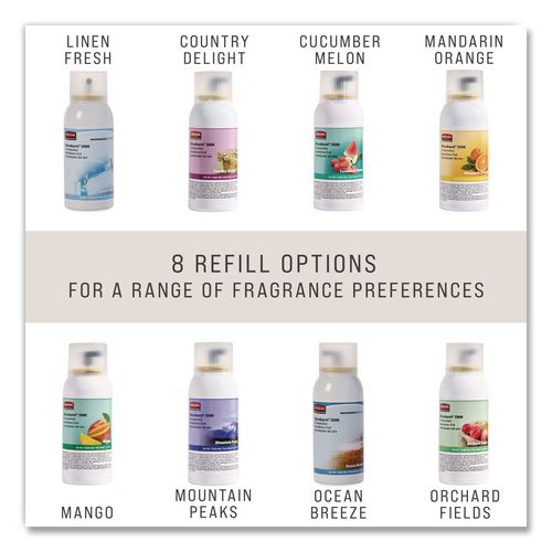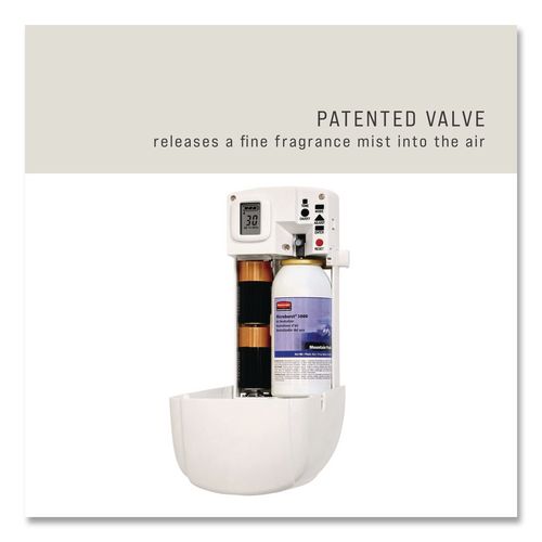 Odor neutralizers break down and eliminate offensive odors, while quickly evaporating fragrances keep your area pleasantly scented. Patented release actuator distributes a fine, dry mist. Long-lasting refill; good for up to 3,000 metered releases.