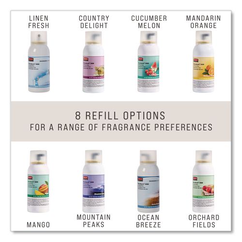 Odor neutralizers break down and eliminate offensive odors, while quickly evaporating fragrances keep your area pleasantly scented. Patented release actuator distributes a fine, dry mist. Long-lasting refill; good for up to 3,000 metered releases.