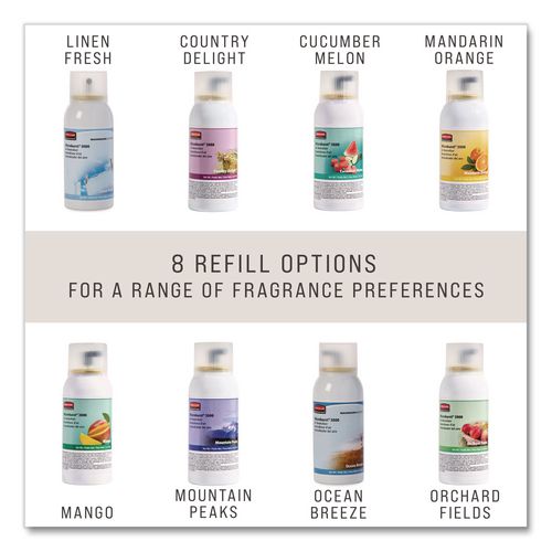 Odor neutralizers break down and eliminate offensive odors, while quickly evaporating fragrances keep your area pleasantly scented. Patented release actuator distributes a fine, dry mist. Long-lasting refill; good for up to 3,000 metered releases.